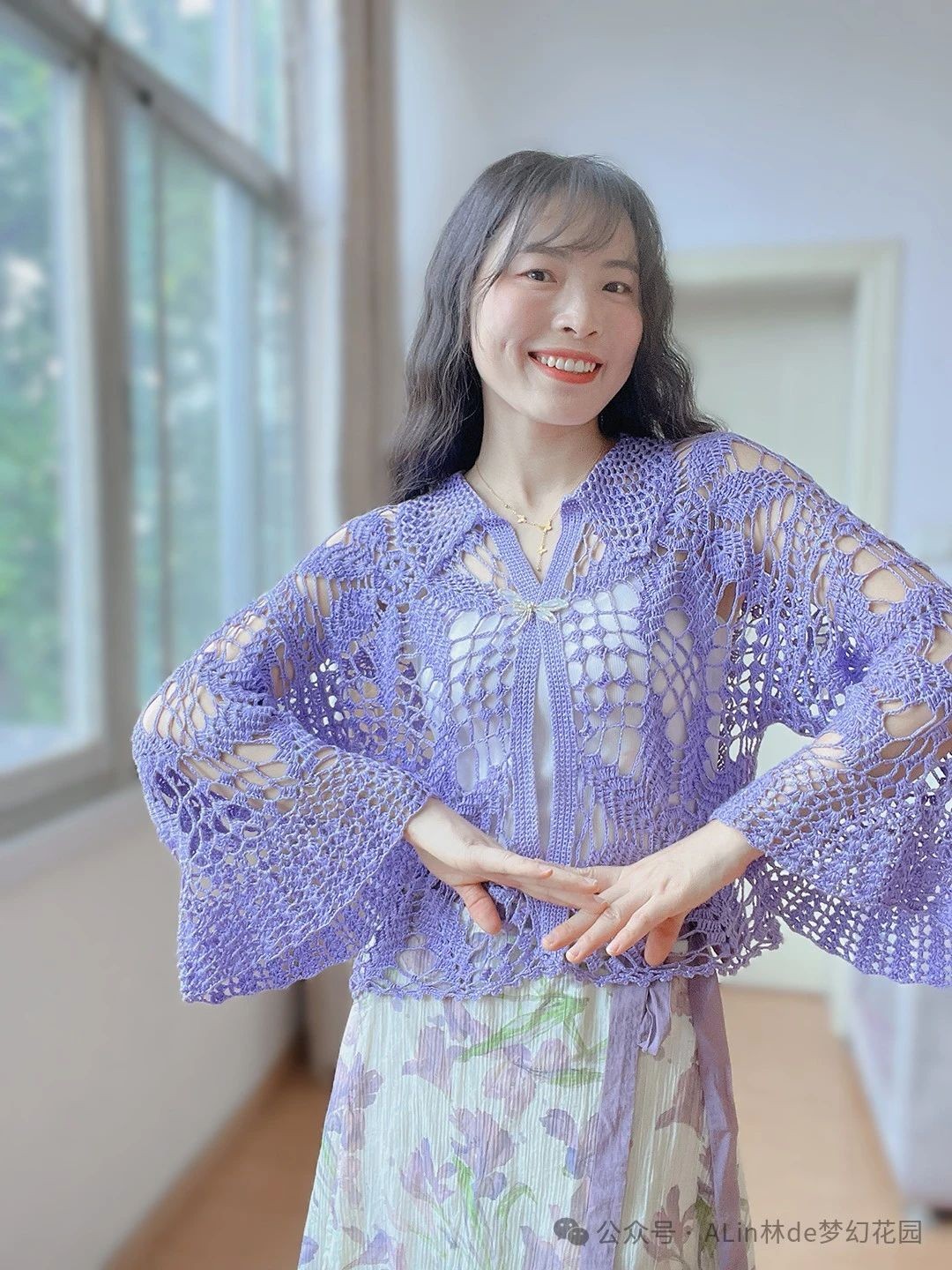 7、【a lin林】捕梦网-毛球新款大拼花喇叭袖钩针开衫(详细教程)